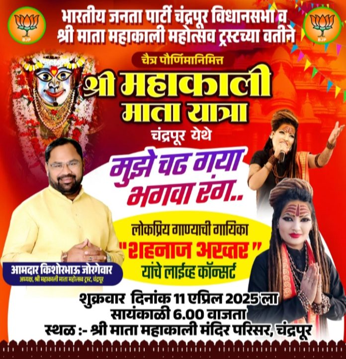 चंद्रपूर :- चैत्र नवरात्र महोत्सवानिमित्त आयोजित करण्यात आलेल्या श्री माता महाकाली यात्रेनिमित्त आमदार किशोर जोरगेवार यांच्या संकल्पनेतून भारतीय जनता पार्टी, चंद्रपूर विधानसभा तसेच श्री महाकाली माता महोत्सव समितीच्या वतीने भव्य भक्तिमय स्वर संध्या कार्यक्रम आयोजित करण्यात आला आहे. या कार्यक्रमात सुप्रसिद्ध गायिका शहनाज अख्तर आपल्या सुमधुर आवाजातून भक्तिरसाचा वर्षाव करणार आहेत. हा कार्यक्रम आज शुक्रवार, दि. ११ एप्रिल रोजी सायंकाळी ६ वाजता महाकाली यात्रा परिसरात संपन्न होणार आहे. Devotional vocal program of famous singer Shehnaaz Akhtar organized in Chandrapur