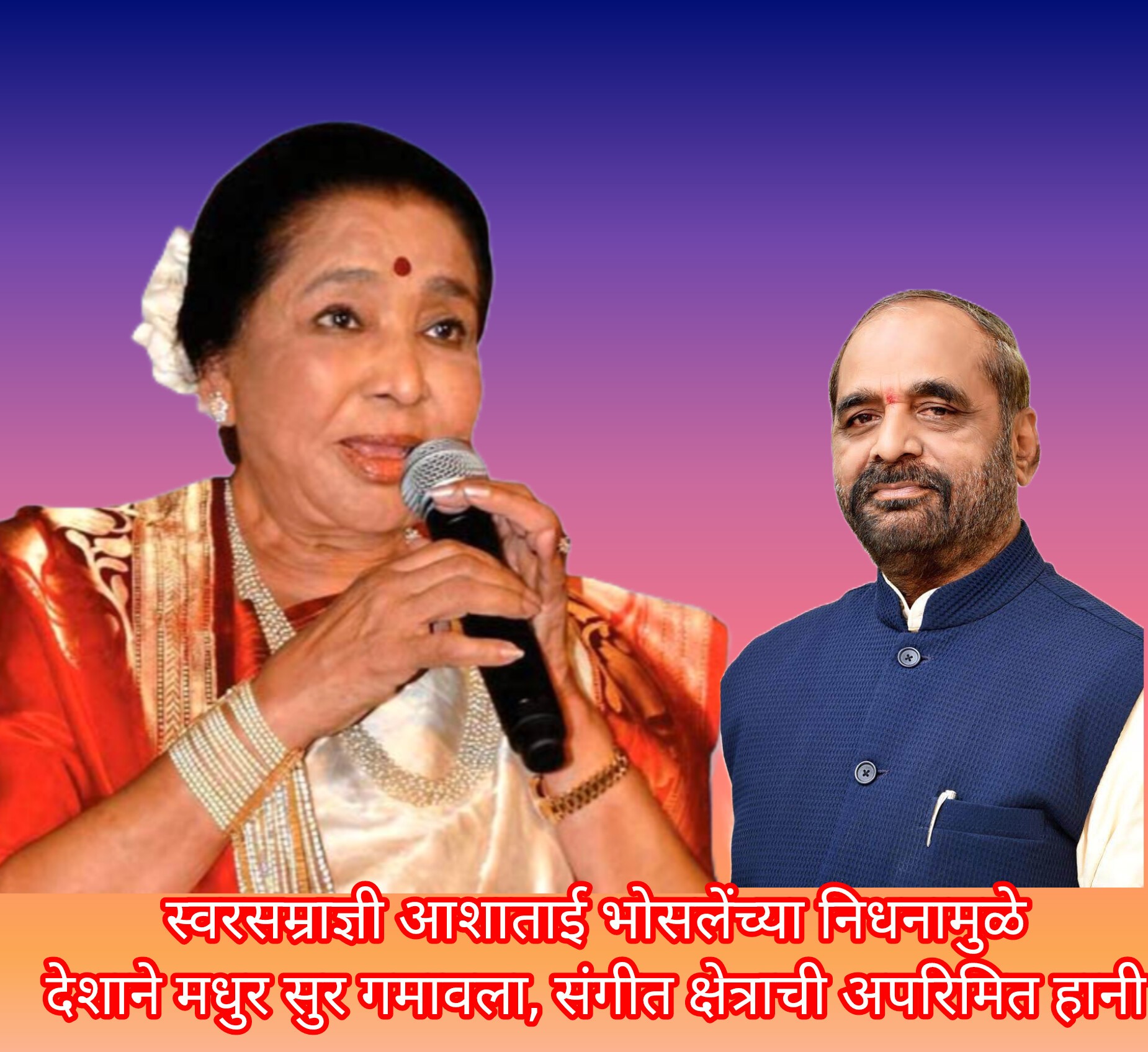 चंद्रपूर :- देशातील कोट्यवधी रसिकांच्या हृदयसिंहासनावर अधिराज्य गाजवणाऱ्या महान पार्श्वगायिका आशाताई भोसले जी Asha Bhosle यांच्या दुःखद निधनाने देशाने मधुर सुर गमावला आहे. एवढेच नव्हे तर भारताच्या सांस्कृतिक ठेव्याची विषेशतः संगीत, कला, चित्रपट या क्षेत्राची अपरिमित हानी झाली असल्याची शोकसंवेदना पुर्व केंद्रीय गृह राज्यमंत्री हंसराज अहीर Hansraj Ahir यांनी व्यक्त केली आहे. Nation has lost a melodious voice; it marks an irreparable loss to the world of music