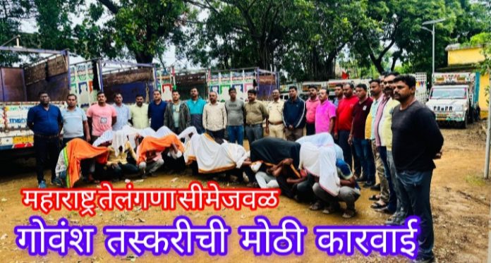 चंद्रपूर :- चंद्रपूर जिल्ह्यातील टेकामांडवा पोलीस स्टेशन हद्दीत स्थानिक गुन्हे शाखेने LCB मोठी कारवाई करत महाराष्ट्र-तेलंगणा राज्य सिमेवरील चिखली खुर्द येथील वन तपासणी नाक्यावर नाकाबंदी करून १७ पिकअप वाहनांतून अवैधरित्या कत्तेसाठी नेल्या जात असलेल्या ५३ गौवंशीय जनावरांची सुटका केली आहे. या प्रकरणी २४ आरोपींना अटक करण्यात आली असून, १ कोटी ५२ लाख ७५ हजार रुपयांचा मुद्देमाल जप्त करण्यात आला आहे. illegal cattle smuggling near Maharashtra-Telangana border