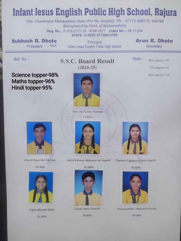 चंद्रपूर :- महाराष्ट्र राज्य माध्यमिक व उच्च माध्यमिक शिक्षण मंडळाच्या दहावी शालांत परीक्षेच्या आज जाहीर झालेल्या सत्र २०२४ – २०२५ च्या निकालात इन्फंट जिजस सोसायटी द्वारा संचालित इन्फंट जिजस इंग्लिश हायस्कूल राजुरा येथील विद्यार्थ्यांनी नेत्रदीपक कामगिरीचे प्रदर्शन करीत १०० टक्के निकाल देण्याची आपली परंपरा याही वर्षी कायम राखली आहे. Infant’s tradition of 100 percent results continues