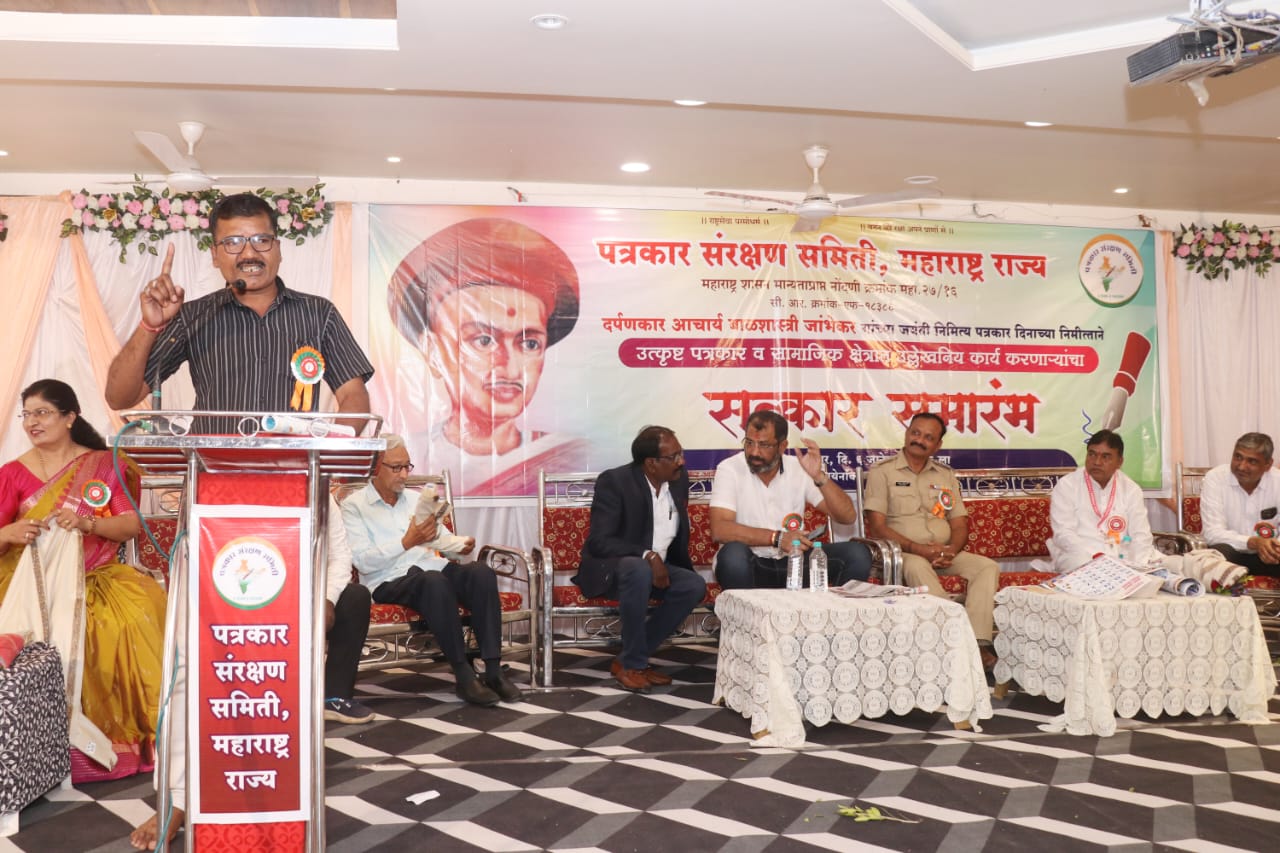 तत्पुर्वी पत्रकार दिनाचे मुख्य वक्ते, पत्रकार संरक्षण समितीचे राज्य उपाध्यक्ष राम खुर्दळ यांनी “ग्रामीण पत्रकारितेचे आजचे वास्तव” विषयावर मांडणी करताना सांगितले की, पाच महिने पूर्वी ग्रामीण पत्रकाराचे राज्यस्तरीय विचार संमेलनाची आठवण करून देतांना राज्यशासन, मंत्री आमदार खासदार यांना निवेदन दिले मात्र विषयांचे गांभीर्य अजूनही लोकप्रतिनिधीना समजले नाही,हिवाळी अधिवेशनात याबद्दल तारांकित मुद्दा उपस्थित केला नाही, आम्ही रस्त्यावर येऊन मूलभूत मुद्द्यासाठी लढतोय, मात्र शासकीय सेवा अधिस्वीकृतीधारकांना मिळतात, आम्ही कायमच वंचित राहिलोय. अजूनही पत्रकार हल्लाविरोधी कायद्याचा लाभ ग्रामीण पत्रकाराना का नाही? वैयक्तिक व कौटुंबिक विमा, पेन्शन सरकार देत नाही,ग्रामीण पत्रकाराना अधिस्वीकृती मिळत नाही त्यासाठी जाचक अटी शर्ती आहेंत, ग्रामीण पत्रकारा वर हल्ले झाल्यास त्याला आधार नसतो मात्र बड्या पडस्थ पत्रकाराना ग्रामीण पत्रकार नेहमी आधार देतात, ग्रामीण पत्रकाराना राज्यभर स्वतंत्र्य पत्रकार भवन नाही, आर्थिक दुर्बल ग्राम पत्रकाराना घरकुल योजना का नाही? पत्रकार अपघात झाल्यास आजारी पडल्यास त्याला शंकरराव चव्हाण पत्रकार कल्याण निधी मिळत नाही ही वस्तुस्थिती आहे? विविध अशासकीय समित्यावार आम्हांला डावलले जाते. जिल्हा माहिती कार्यालयात ग्रामीण पत्रकार नोंद नसते, शासकीय प्रेस ला ते ग्रामीण पत्रकारा ना उभं ही करीत नाही आम्ही पाठपुरावा करतोय पण सरकार त्यांचे नेते, माहिती विभाग आमची उपेक्षा करत आहे.