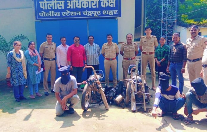 चंद्रपूर :- चंद्रपूर शहर पोलिसांनी दुचाकी वाहन चोरी करून ग्राइंडर मशीनने कापून तुकडे करून विकणाऱ्या टोळीचा पर्दाफाश केला आहे, यात 2 दोघे मोटर सायकल चोरटे, 1 वाहने कटिंग करणारा व एक खरेदी करणारा अशा 4 आरोपींना अटक करीत एकूण 57,000 रुपयांचा मुद्देमाल जप्त करण्यात आला आहे. motorcycle theft case exposed