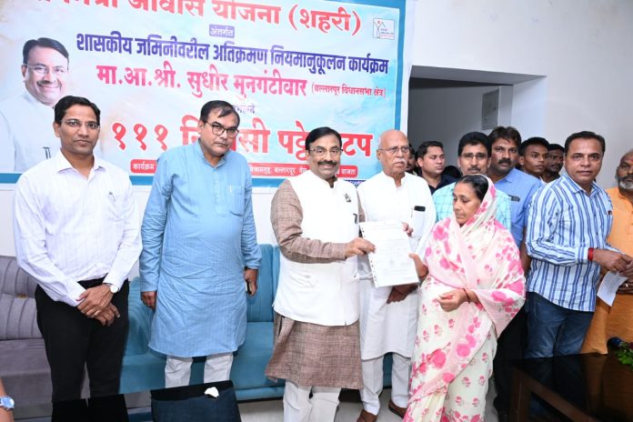 बल्लारपूर मधील सागर जुनघरे, चंद्रशेखर लिचोडे, लक्ष्मी डोंगरवार, मन्सूर शेख, कविता किन्हेकर, वैभव कायरकर, किशोर कायरकर, मंगलसिंग जाधव, शलिता कोवे, नरसिंगराव नरगुला, परविन शेख, शफी खान आदी अतिक्रमणधारकांना प्रतिनिधिक स्वरूपात आमदार श्री. सुधीर मुनगंटीवार यांच्या हस्ते पट्ट्यांचे वाटप करण्यात आले.