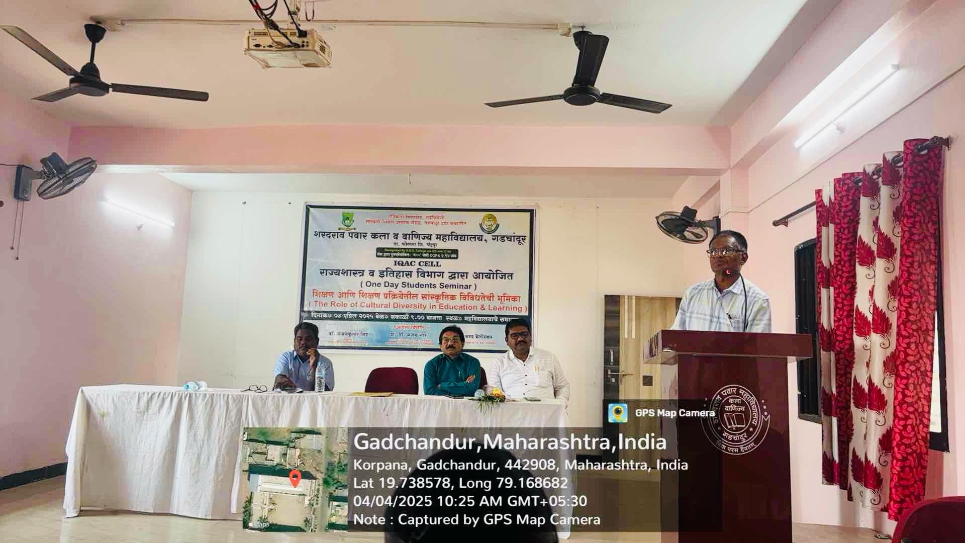 चंद्रपूर :- शरदराव पवार कला व वाणिज्य महाविद्यालय गडचांदूर येथे महाविद्यालयाचे गुणवत्ता हमी कक्ष,राज्यशास्त्र आणि इतिहास विभागाच्या वतीने आयोजित “शिक्षण आणि शिक्षण प्रक्रियेत सांस्कृतिक विविधतेची भूमिका”या विषयावर विध्यार्थ्यांकरिता एकदिवसीय चर्चासत्र प्राचार्य डॉ.संजय कुमार सिंग यांचे मागदर्शनाखाली आयोजित करण्यात आले. Seminar on ‘Role of Cultural Diversity in Teaching and Learning Process’